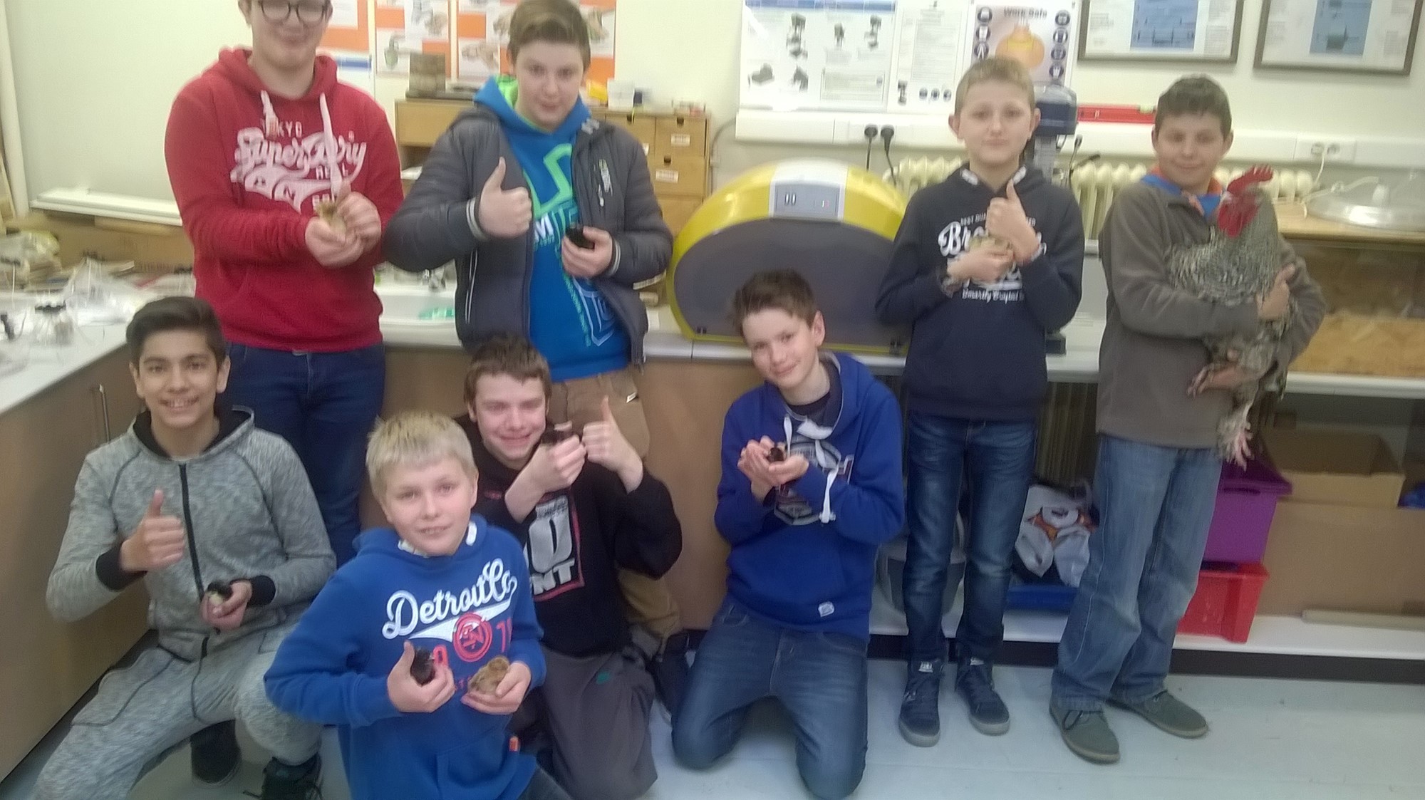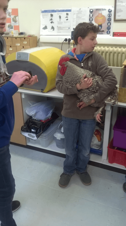 "Elk jaar voor de paasvakantie broeden wij, de leerlingen van het KTA GITBO te Keerbergen België, kuikentjes uit die de leerlingen (waarvan ouders hebben aangegeven dat ze er goed voor zorgen) dan mee naar huis mogen nemen. Op de foto zien jullie onze klas met kuikens en ook Daan met onze Mechelse koekoek haan, een product van vorig schooljaar waar hij heel trots over mag zijn."
