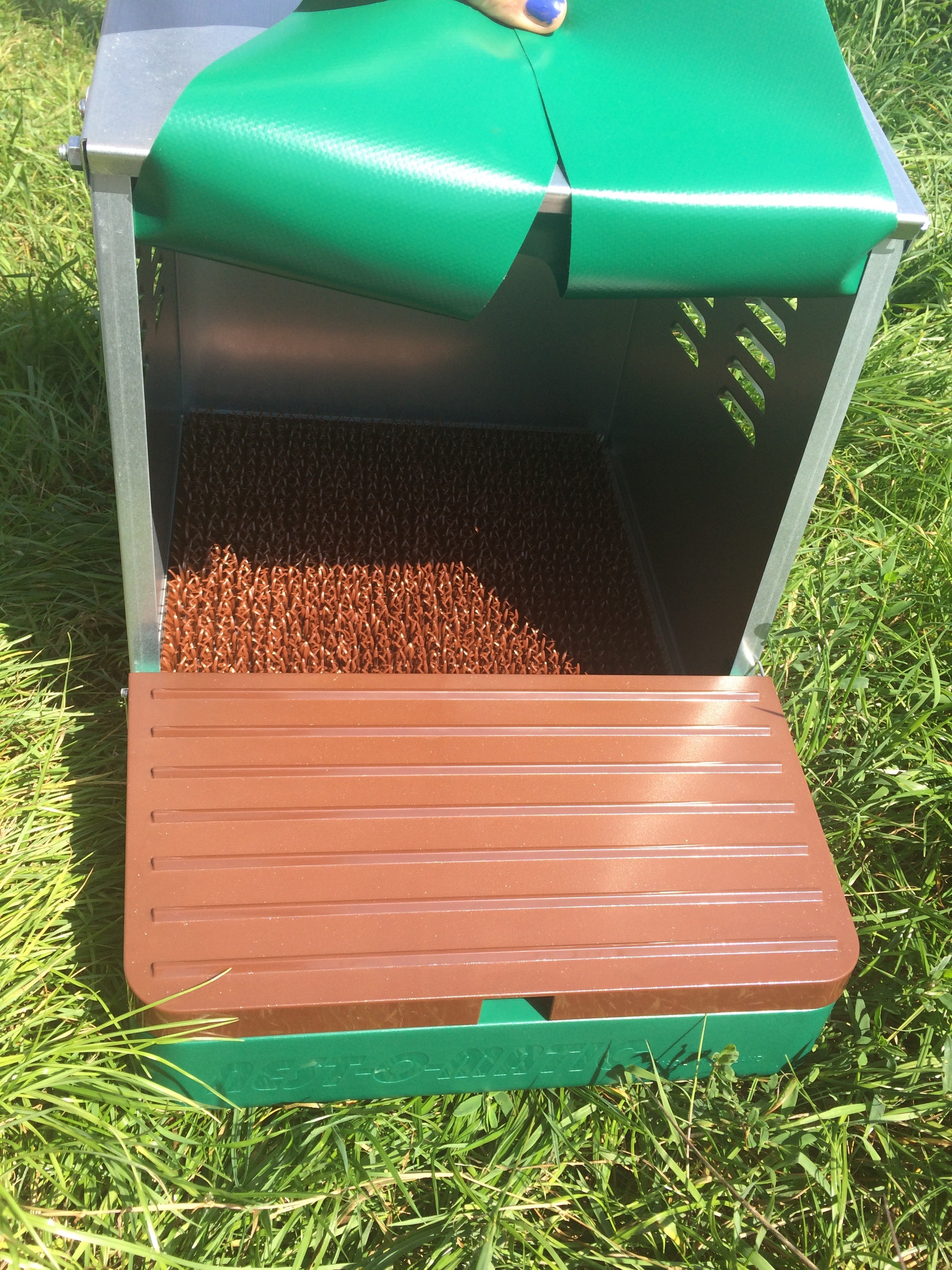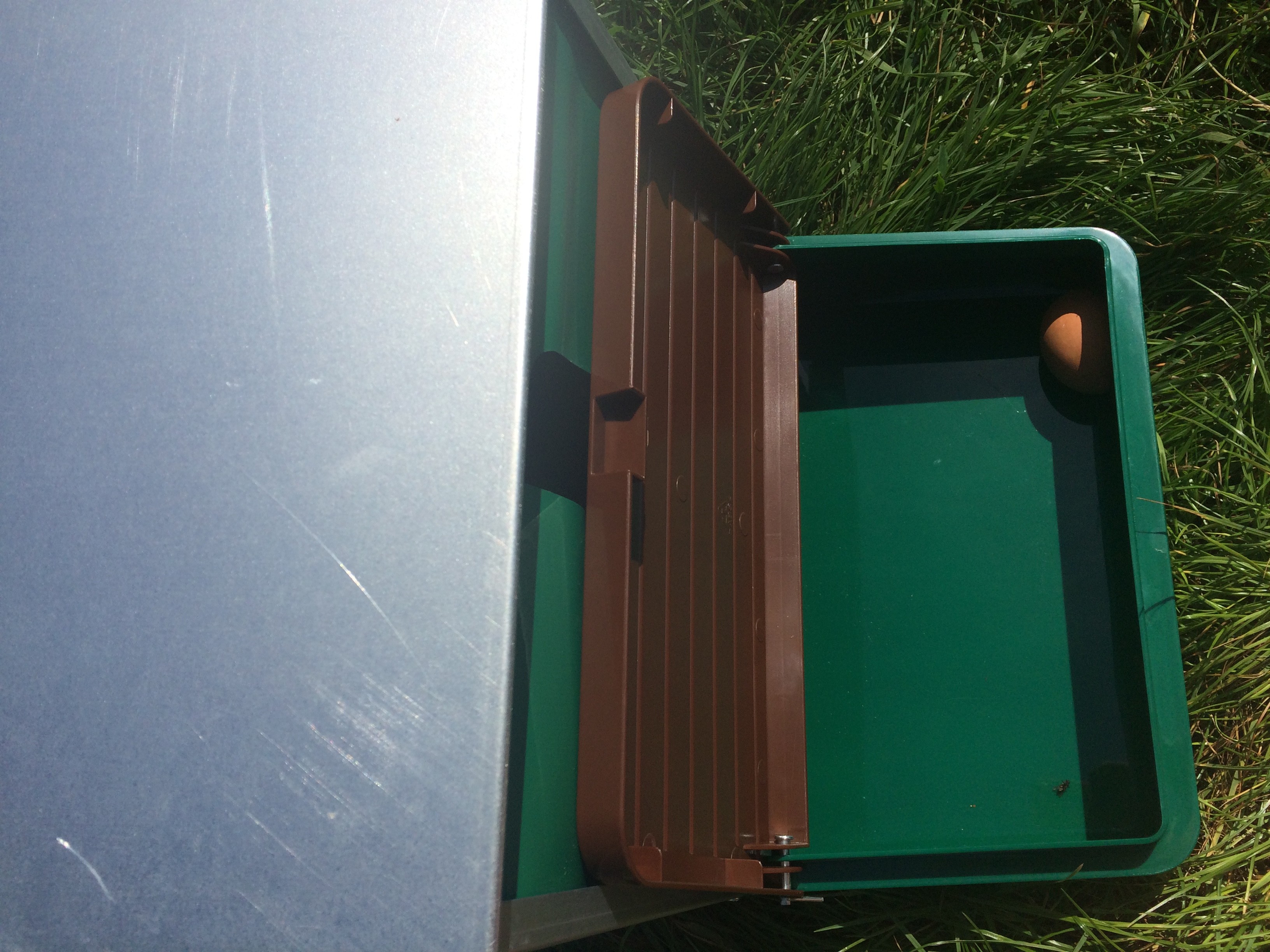 - Het klepje over het eierbakje scharniert en zorgt dat je eieren schoon blijven, daarnaast is de deksel voorzien van ribbels waardoor de kippen gemakkelijk in het legnest lopen.