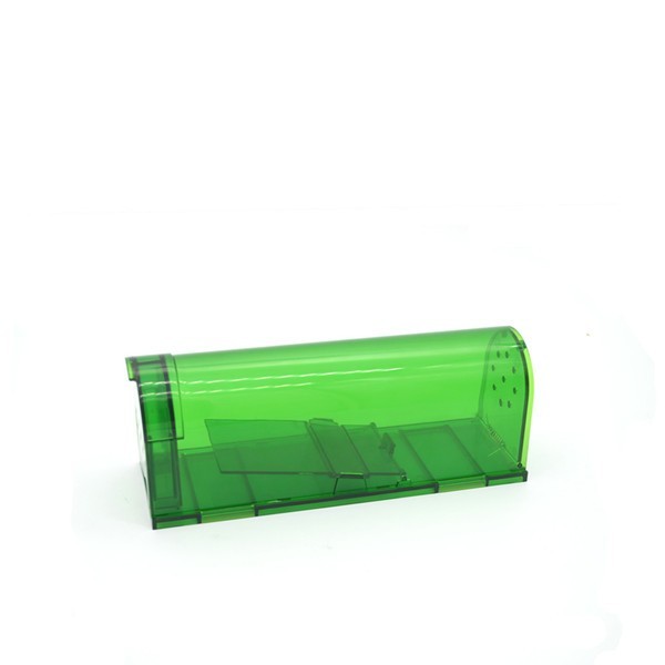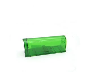 Je duwt het deurtje open met slechts één vinger en de val is klaar voor gebruik (je vingers kunnen nooit klem komen te zitten).Als de rat over de wip loopt, sluit het deurtje zich en heb je de rat gevangen.